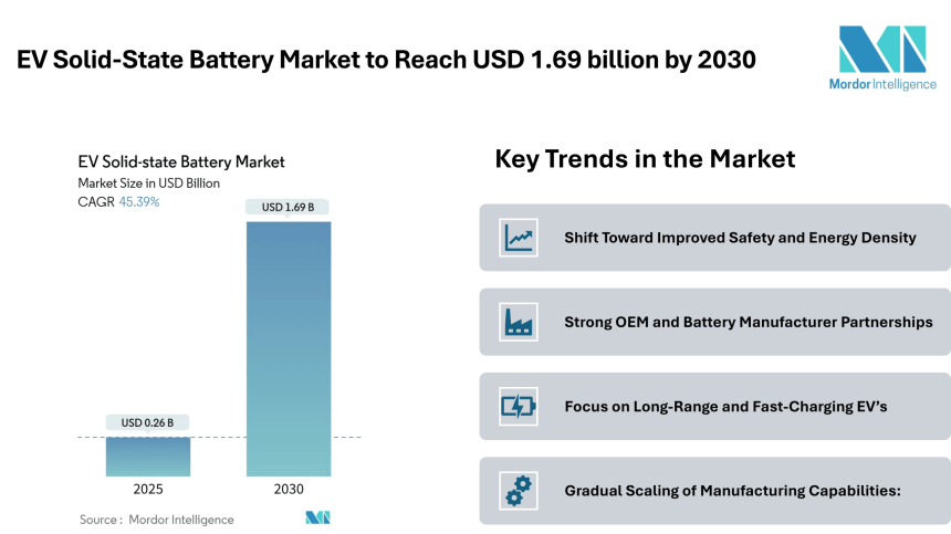 EV Solid-State Battery Market to Reach USD 1.69 billion by 2030, Driven by Safety-Focused Designs and OEM Integration – Mordor Intelligence
